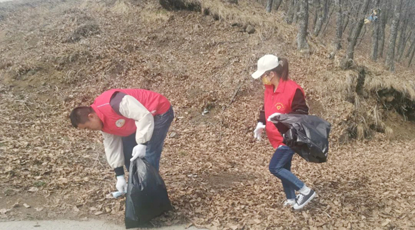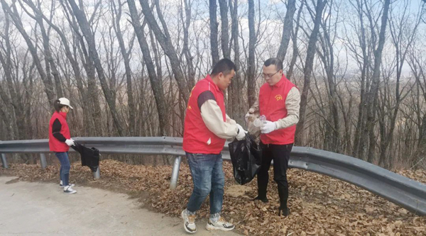 大家自備手套、水靴、剪刀、袋子、皮繩等清掃工具,從石青山的山腳下開始,對環(huán)山路兩側(cè)的垃圾進行全面清理、裝運。有的鉆入樹林,撿拾白色垃圾;有的摘除破損條幅,更換新貌;有的收堆、撐袋,將垃圾裝車運走。醒目的條幅標語,飄揚的志愿服務隊隊旗,鮮紅的志愿者身影,忙碌的勞動場面,構成了一幅五彩斑斕的畫卷。